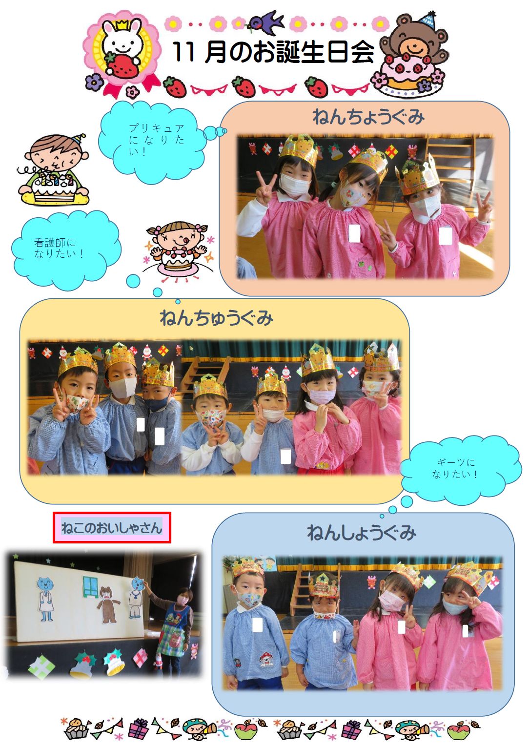 アルバム 一覧に戻る 【2022/11/28】11月誕生会 11月生まれの誕生会を行いました。 パネルシアター「ねこのおいしゃさん」を見ました。すぐに歌を覚え、一緒に歌って楽しむことができました。 写真はコチラ