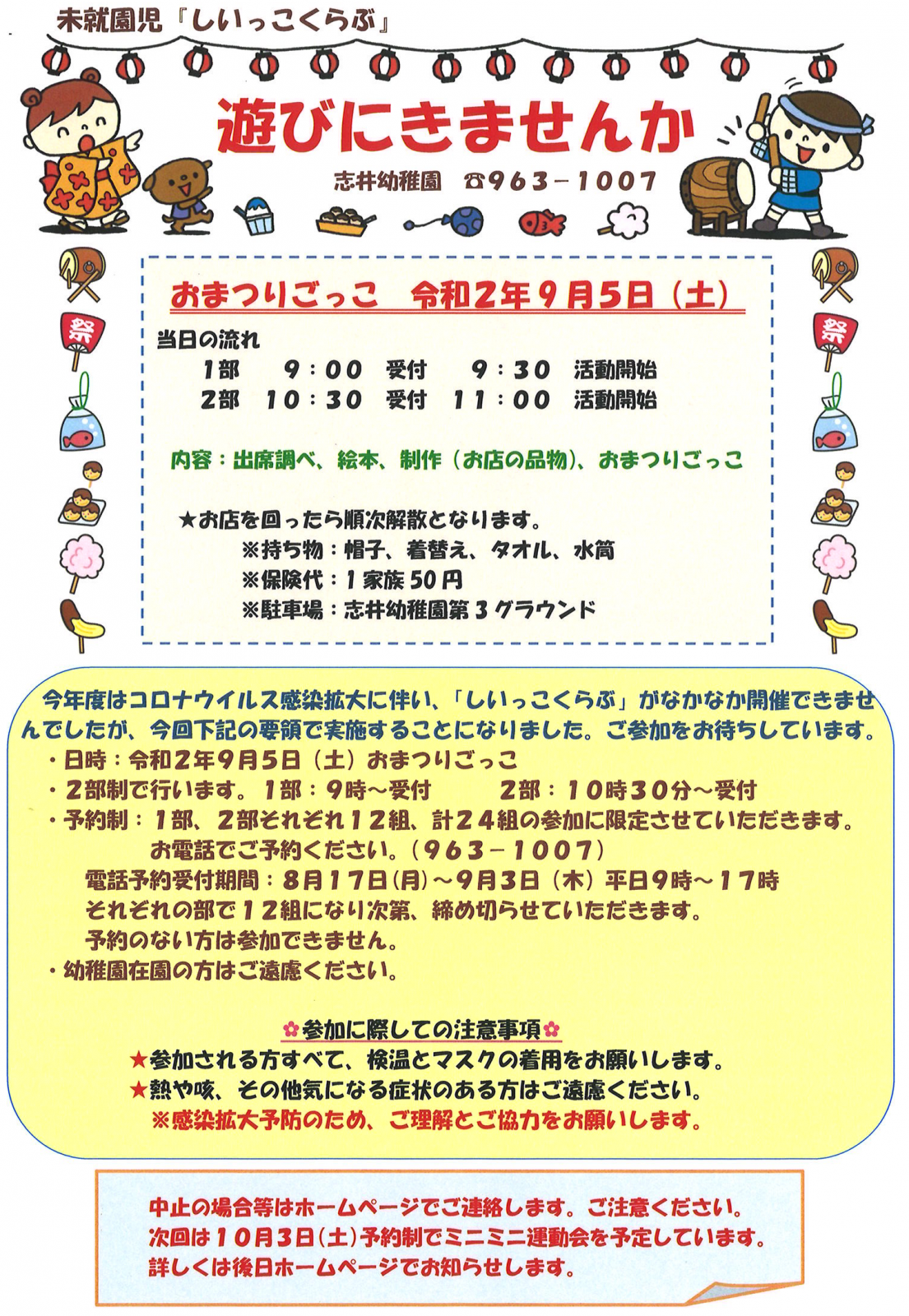 令和2年9月5日(土)未就園行事「遊びにきませんか」を行います。