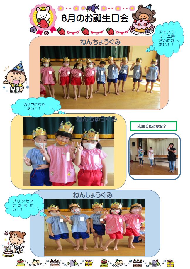 アルバム 一覧に戻る 【2022/08/29】8月誕生会 8月生まれの誕生会を行いました。 今月の出し物は『先生、できるかな?』をしました。 クラスの先生がいろんなことに挑戦しました。子どもたちが頑張る先生をたくさん応援してくれました。 写真はコチラ