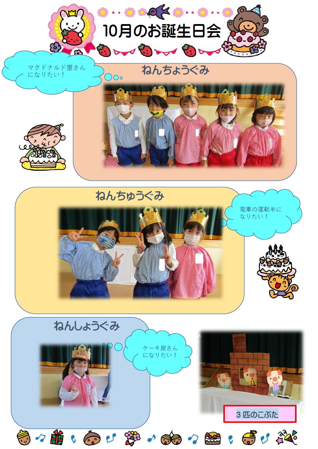 アルバム 一覧に戻る 【2022/10/31】10月誕生会 10月誕生会を行いました。 今月の出し物は『切り絵クイズ』と『3匹のこぶた』のペープサートでした。乗り物やみんなの好きなキャラクターも出て来て、元気よくクイズに参加していました。 写真はコチラ