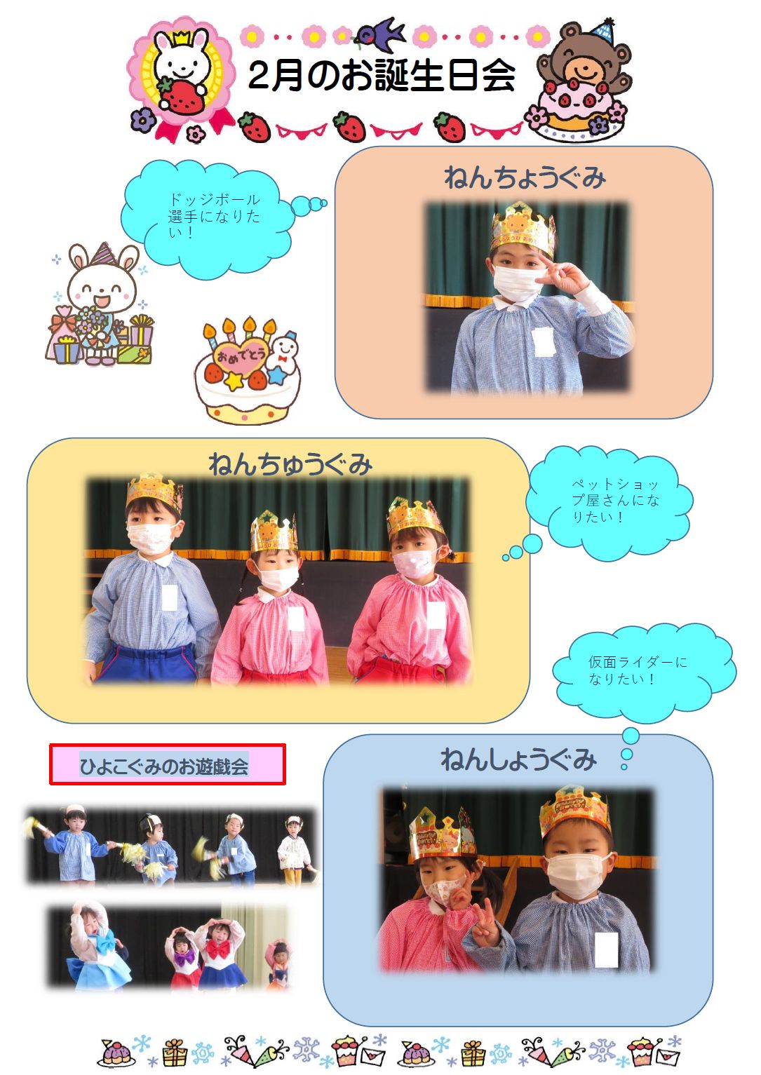 アルバム 一覧に戻る 【2023/02/27】2月誕生会 2月生まれの誕生会を行いました。 今回の誕生会はひよこ組がお遊戯会で踊った踊りを披露してくれました。ひよこ組の可愛さにみんな釘付けでした。 写真はコチラ